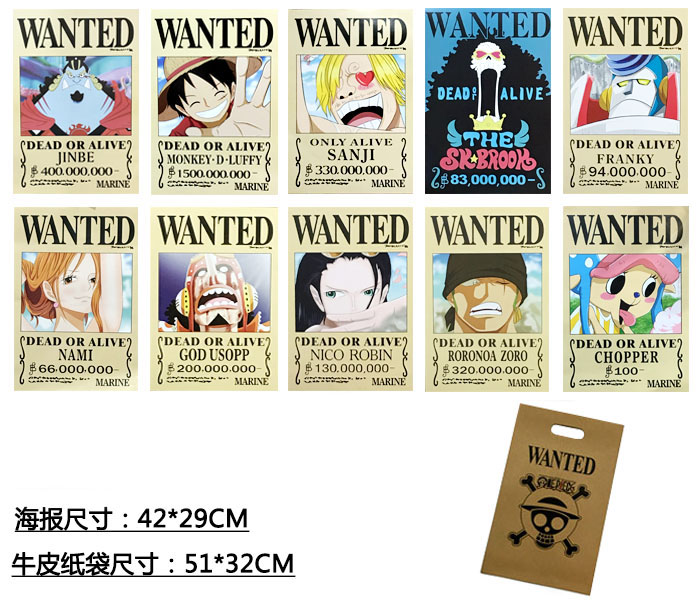 海贼王路飞团10人通辑令(送牛皮纸袋)